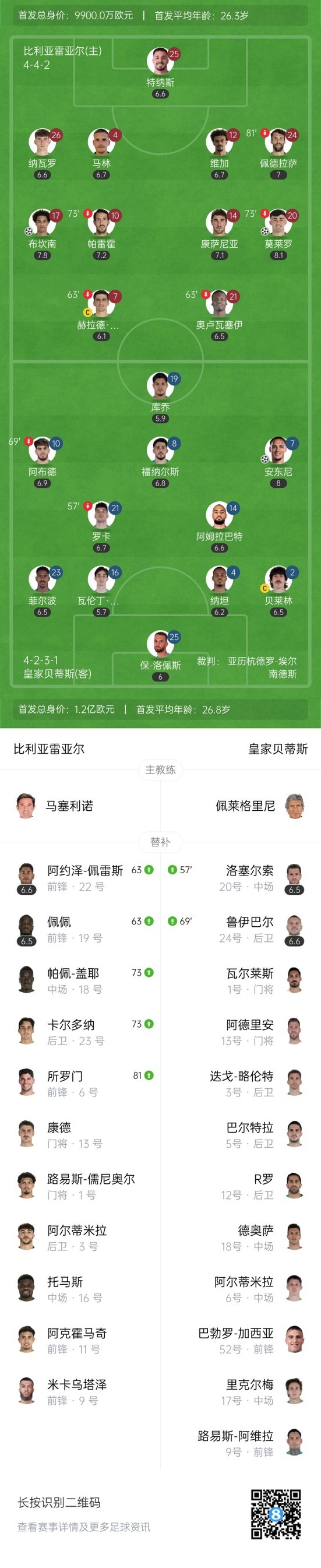 下半场补时5分钟,比利亚雷亚尔2-2贝蒂斯。