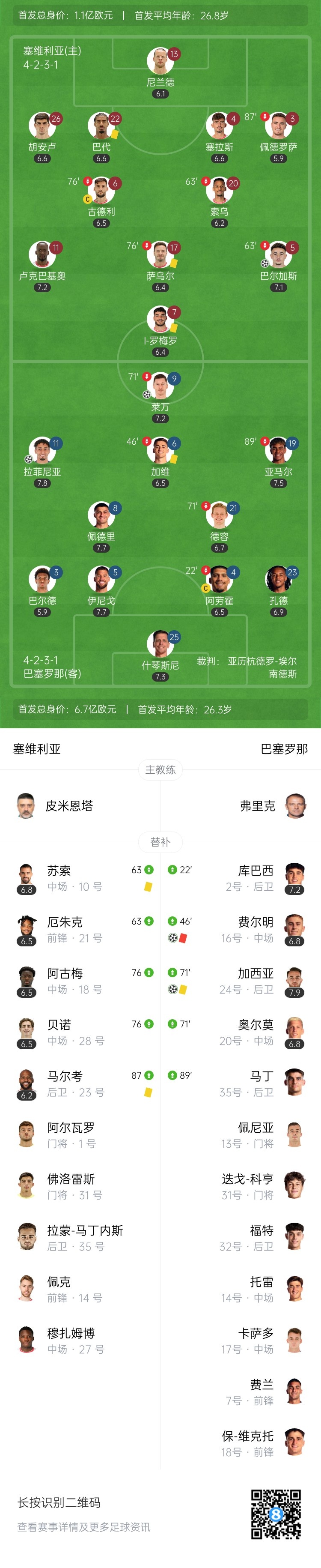 第89分钟,巴萨前场右侧定位球机会开出,后点埃里克-加西亚头球破门再下一城,巴萨4-1塞维利亚↓