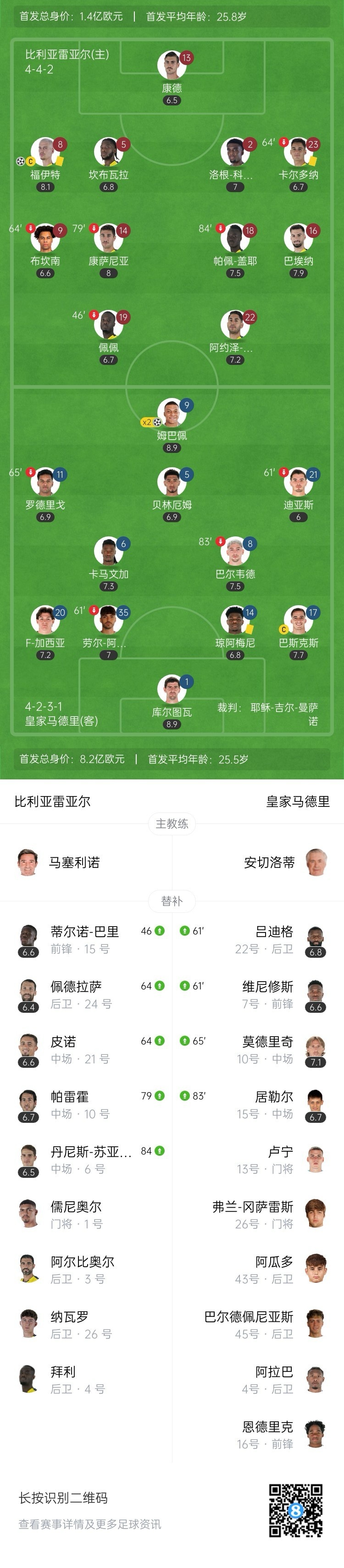 全场比赛结束,皇马2-1比利亚雷亚尔。