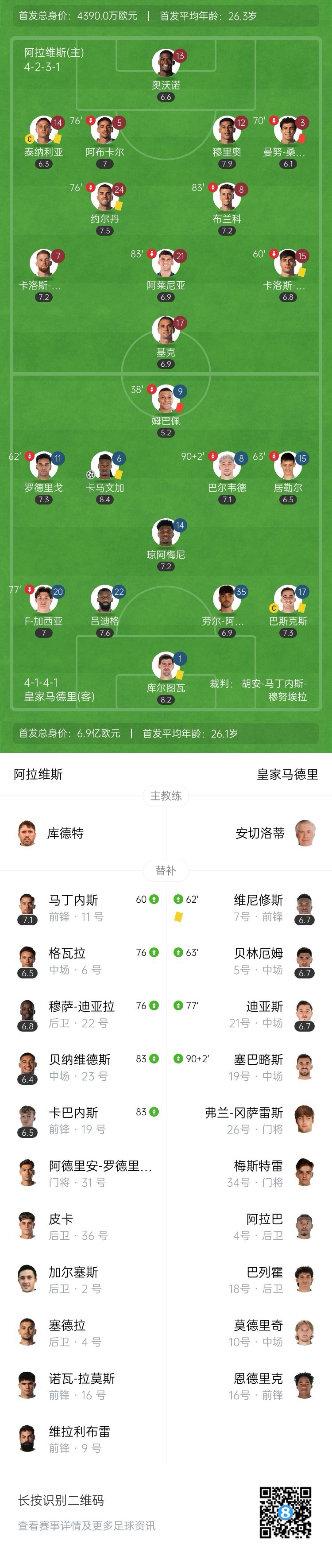 全场比赛结束,十人皇马客场1-0战胜十人阿拉维斯。