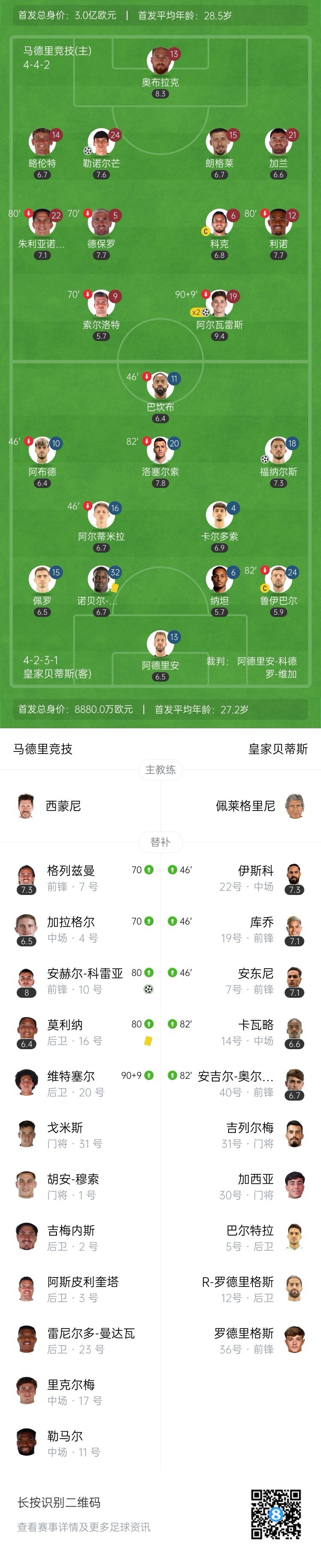 圆神启动!下半场易边再战,安东尼和伊斯科替补登场。↓