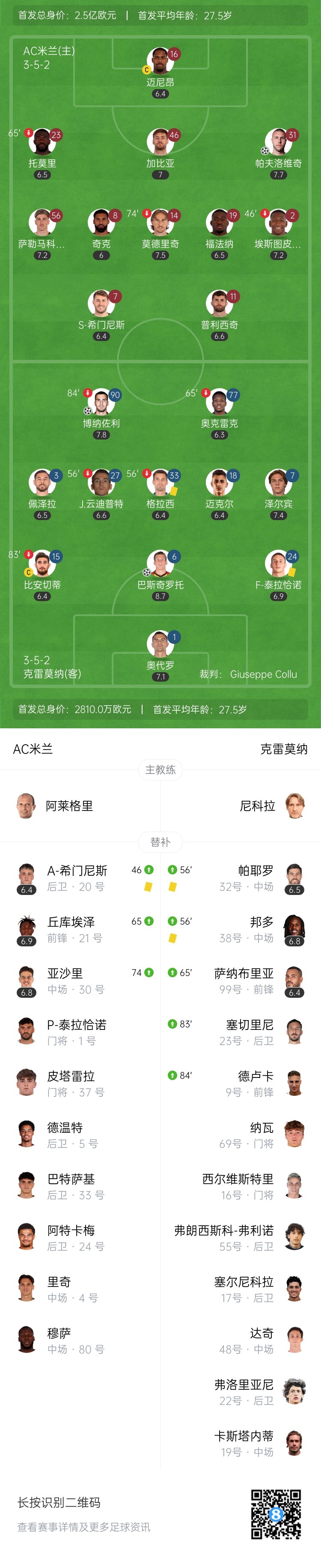 第45+1分钟,泽尔宾与萨勒马科尔斯对抗后倒地,萨勒马科尔斯左路内切后直塞,埃斯图皮尼安下底传中,后点帕夫洛维奇头球攻门得手,AC米兰1-1克雷莫纳。↓