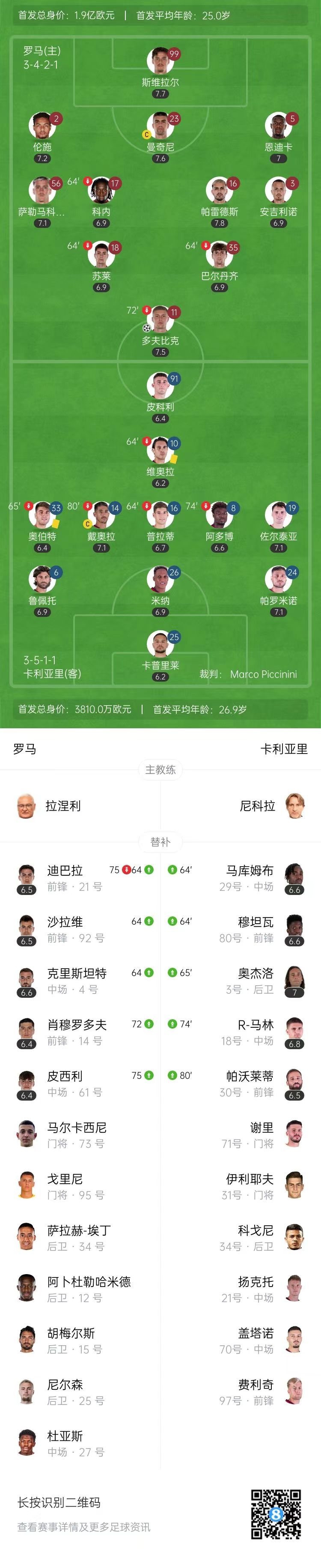 第75分钟,迪巴拉替补登场,一次脚后跟触球后受伤离场。↓