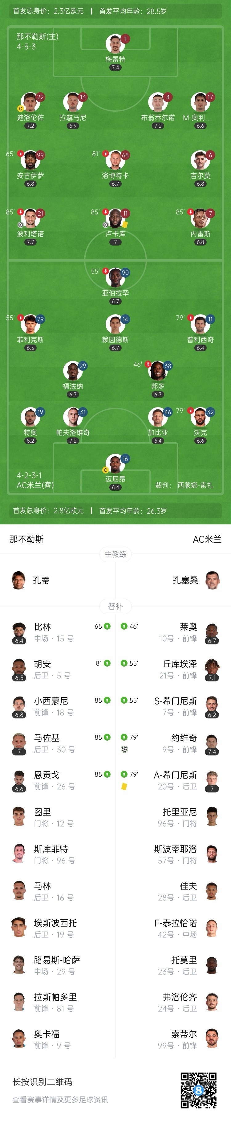 全场比赛结束,那不勒斯2-1赛季双杀AC米兰。