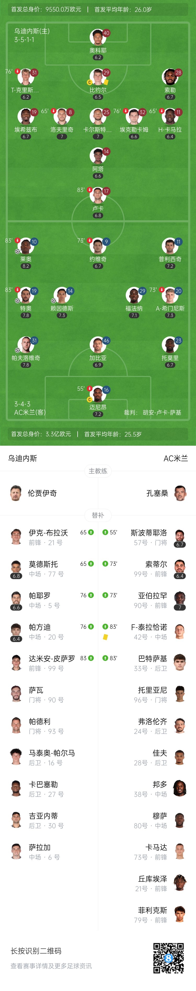 第74分钟,特奥左边路杀进禁区无人阻拦,左脚直接爆射破门!AC米兰3-0领先乌迪内斯↓