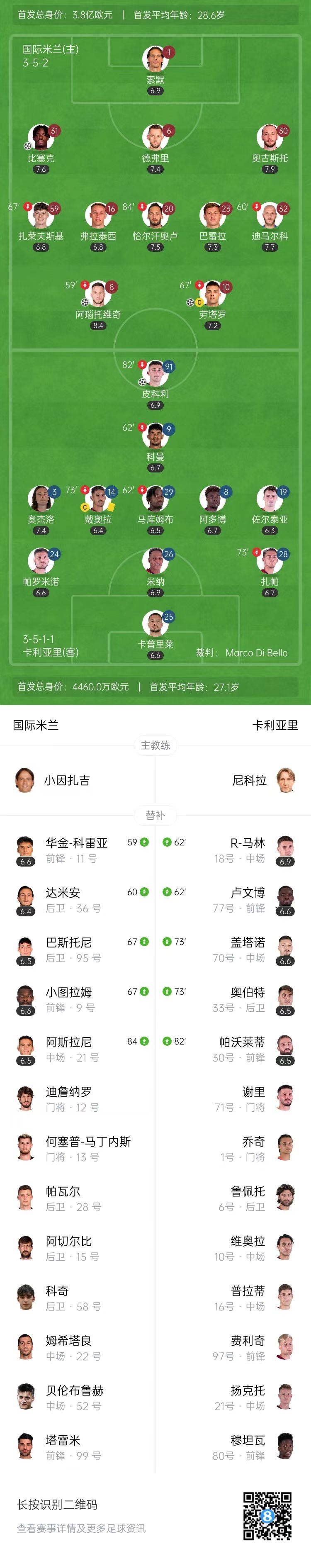 第25分钟,卡利亚里反击,皮科利带球进入禁区,面对索默一脚打门被扑出。↓