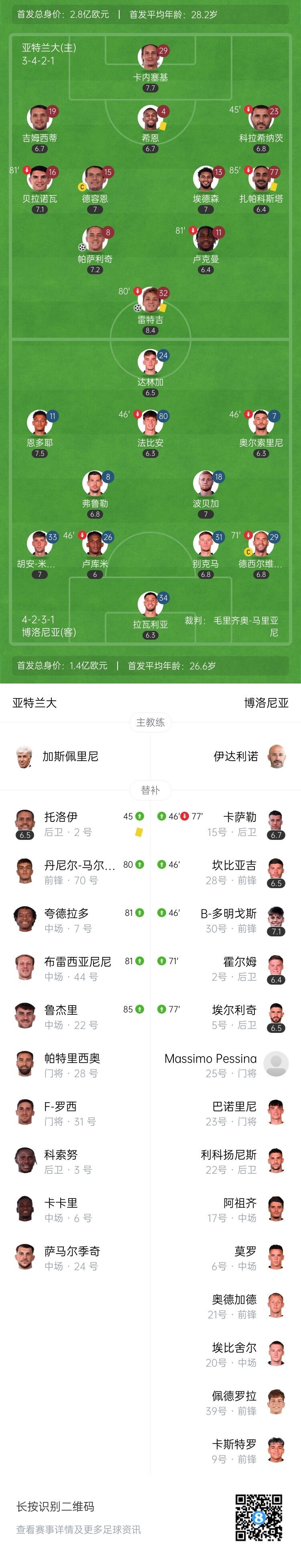 伤停补时6分钟。全场比赛结束,亚特兰大2-0博洛尼亚。