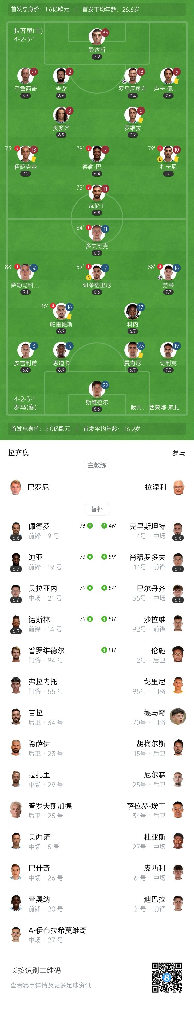 全场比赛结束,罗马1-1拉齐奥。