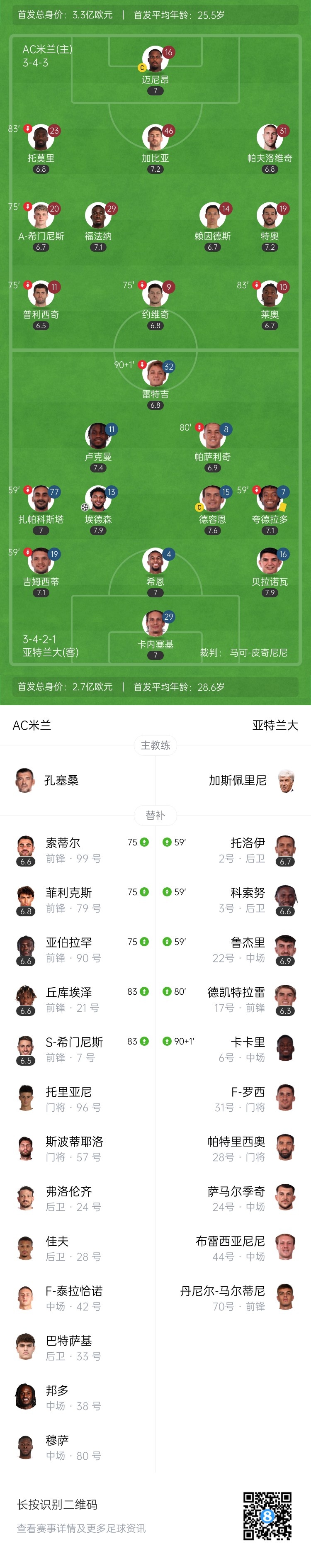 第62分钟,卢克曼内切右脚送传中,禁区内后点贝拉诺瓦头球摆渡到门前,埃德森鱼跃冲顶接力破门!亚特兰大1-0领先AC米兰↓