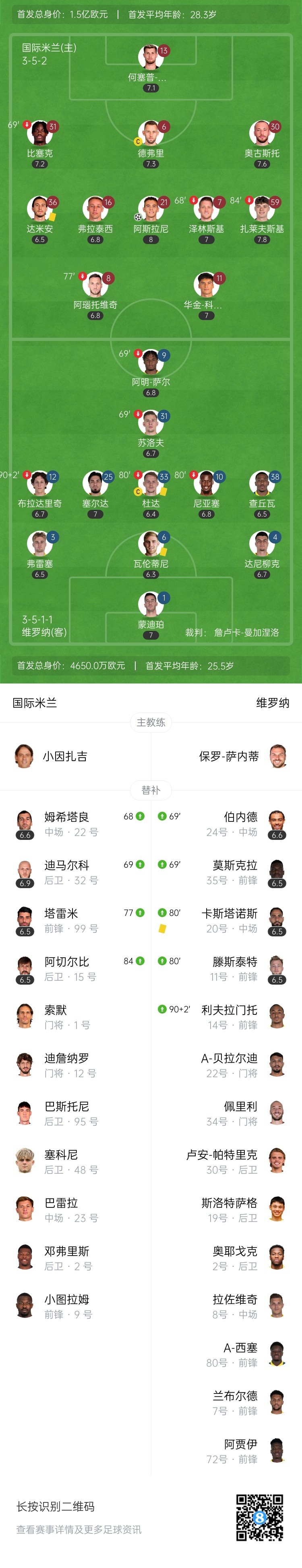 第8分钟,瓦伦蒂尼禁区内防守过程中手碰到皮球,随后VAR介入,主裁判判给国米点球,阿斯拉尼主罚命中,国米1-0领先!↓