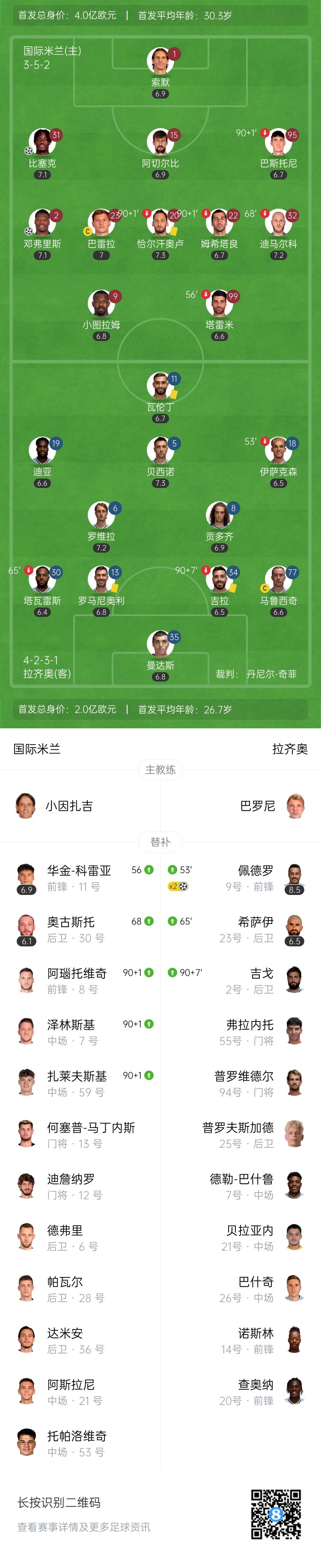 全场比赛结束,最终国际米兰2-2拉齐奥。