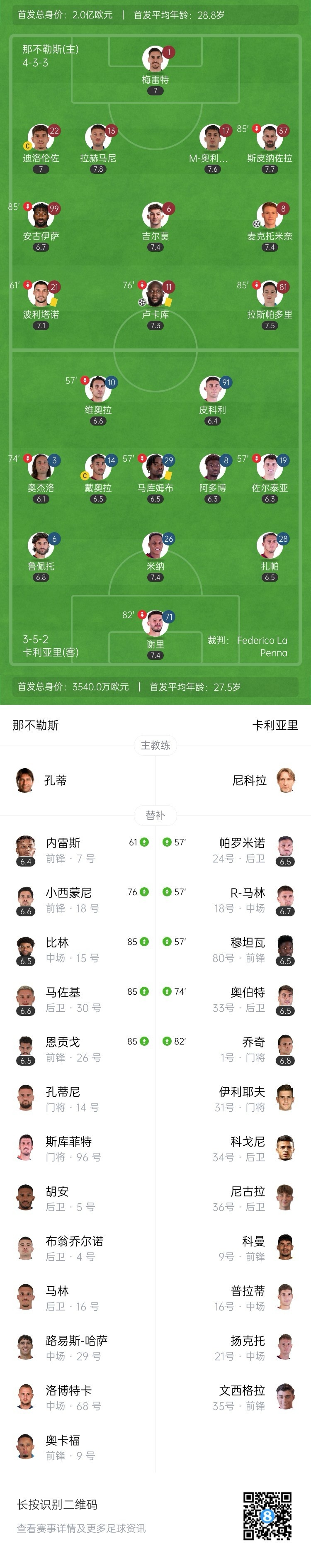 全场比赛结束,那不勒斯2-0卡利亚里。