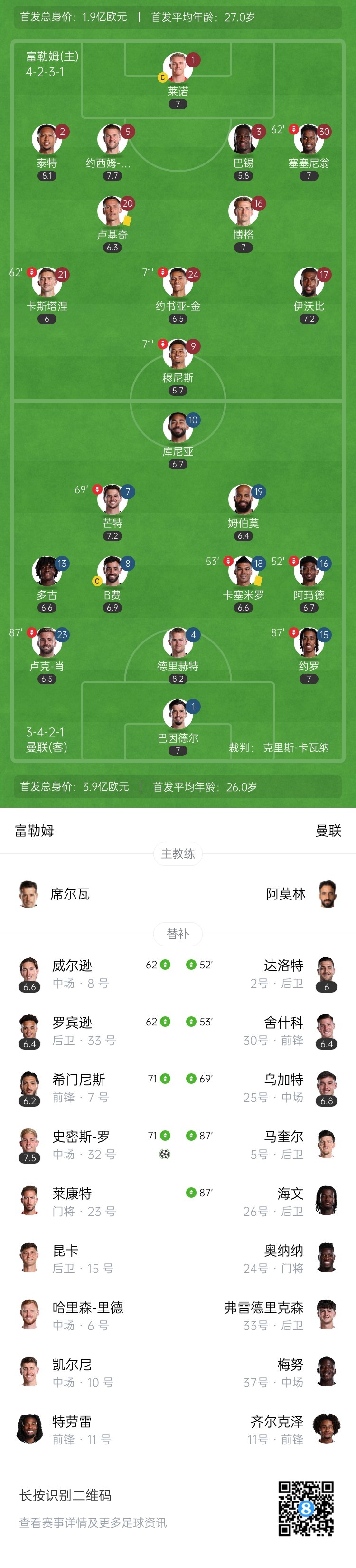 下半场伤停补时5分钟,全场比赛结束,最终曼联1-1富勒姆。