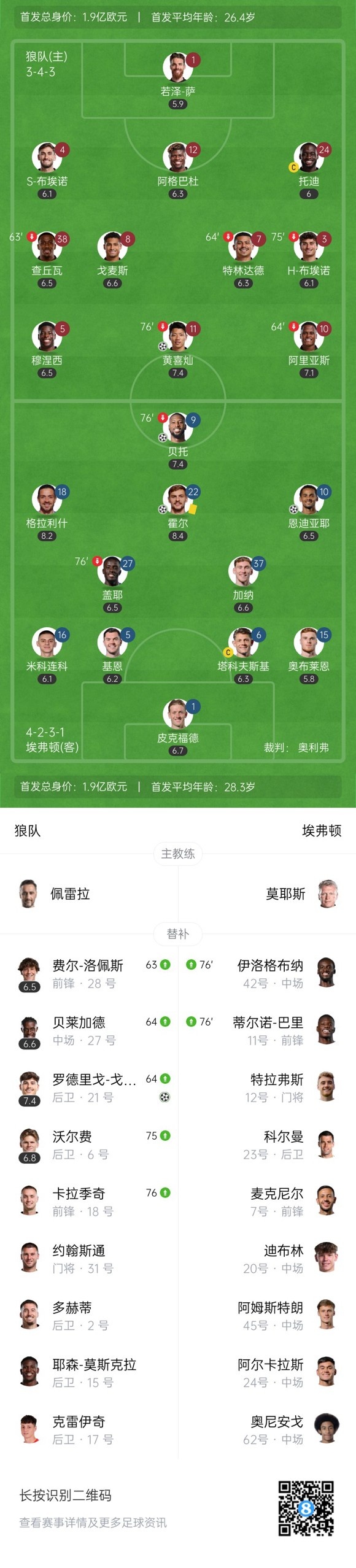 上半场补时3分钟,狼队1-2埃弗顿。