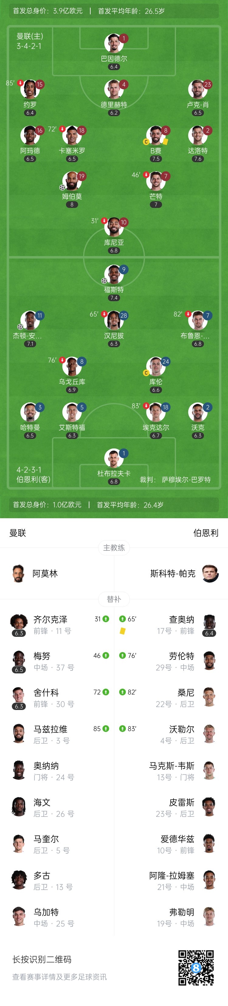 上半场伤停补时8分钟,第45+5分钟,曼联反击机会,齐尔克泽斜传,前场二打一,姆伯莫选择了传球,阿玛德面对空门的射门推射打飞了。↓