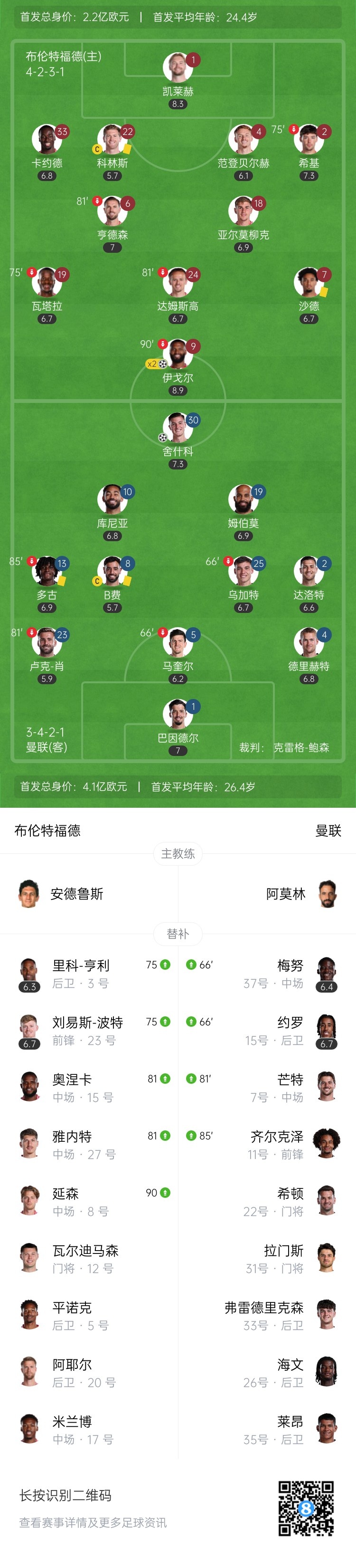 下半场伤停补时8分钟,全场比赛结束,最终曼联1-3布伦特福德。