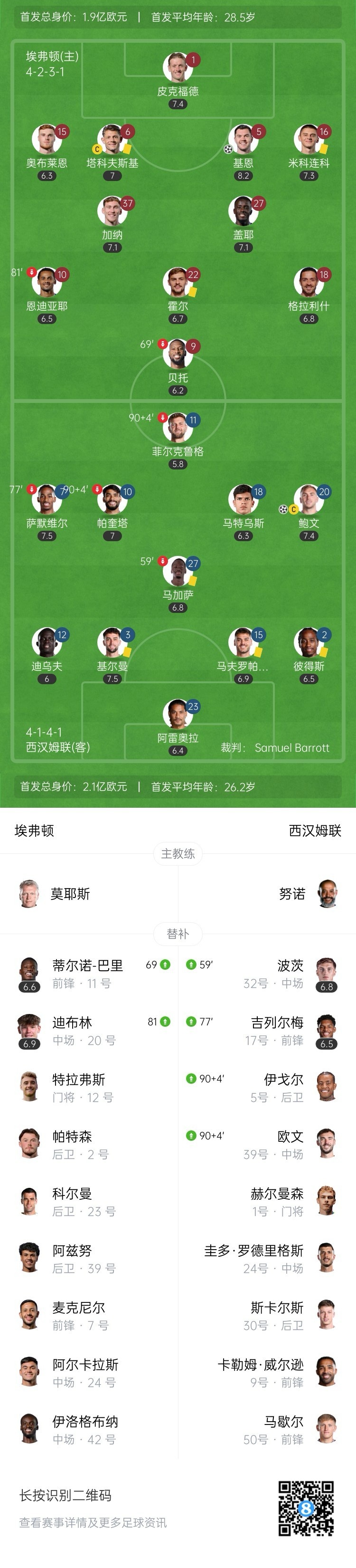全场比赛结束,埃弗顿主场1-1战平西汉姆联。
