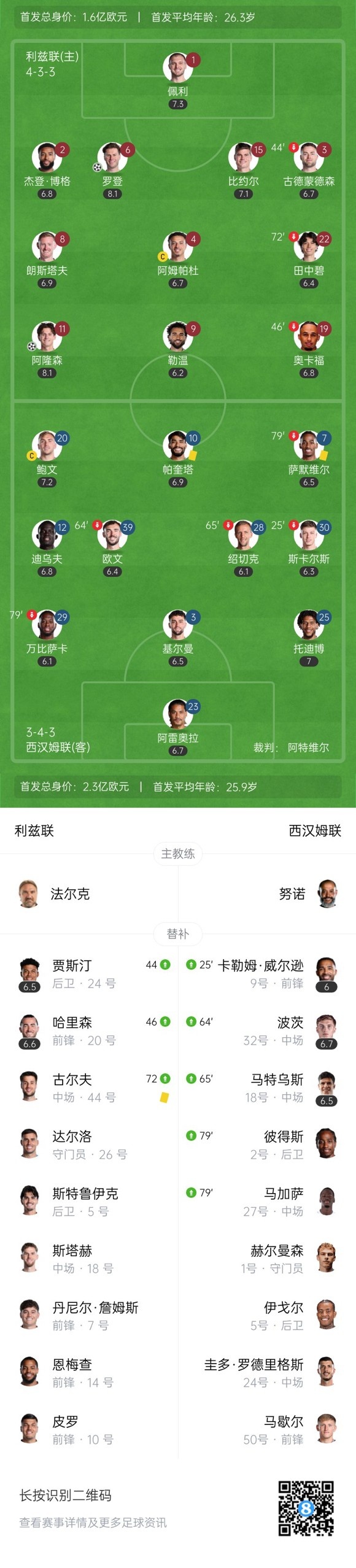 下半场易边再战,第77分钟,久攻不下的西汉姆进行大规模换人。↓