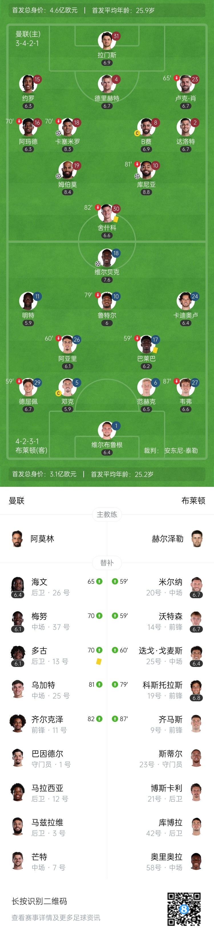 第90+6分钟,梅努中圈向前送出直塞,姆伯莫得球突入禁区,随后起脚爆射,这球击中横梁下沿弹进球门,曼联4-2布莱顿。↓