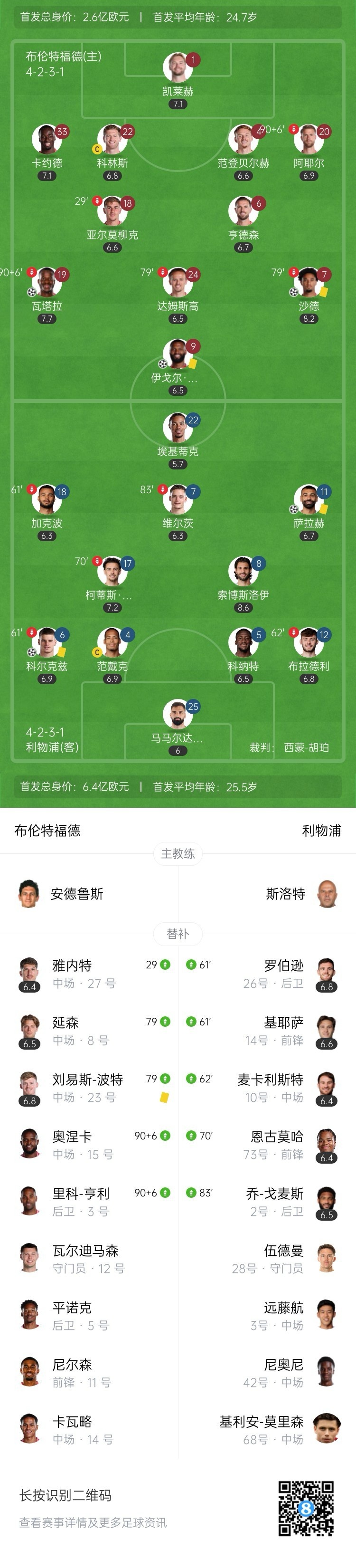 全场比赛结束,利物浦2-3布伦特福德。