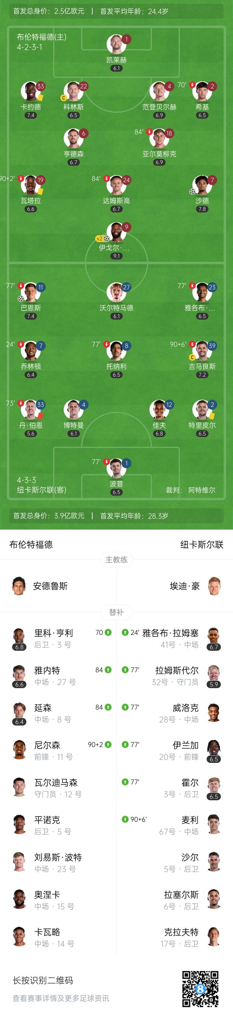 伤停补时11分钟。全场比赛结束,布伦特福德3-1纽卡斯尔联。