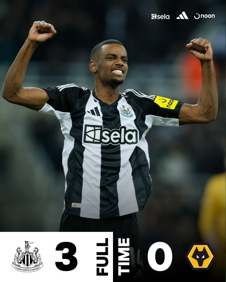 全场比赛结束,纽卡斯尔3-0狼队。