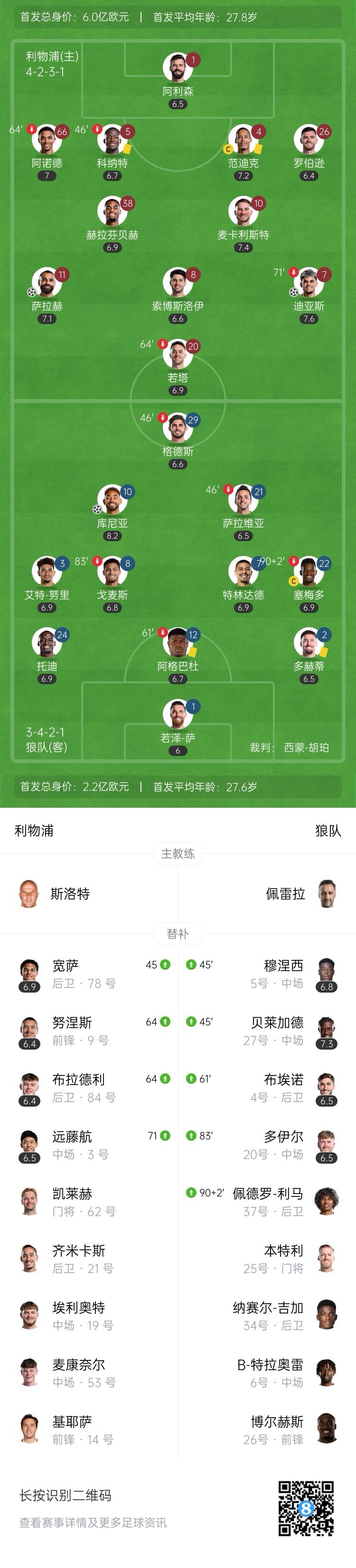第15分钟,利物浦取得领先,迪亚斯左路带球至禁区前沿后转移找到萨拉赫,萨拉赫直接传球,托迪解围不远,迪亚斯撞射破门,利物浦1-0领先狼队。↓