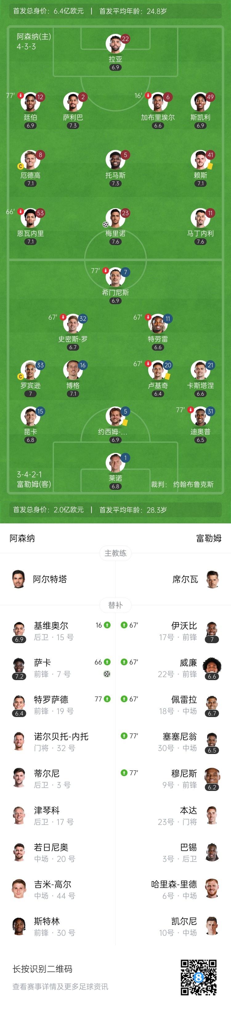 第73分钟,马丁内利推进后分球,梅里诺左路送出传中,马丁内利神龙摆尾将球传到萨卡身前,萨卡头球攻门得手,阿森纳2-0富勒姆。↓