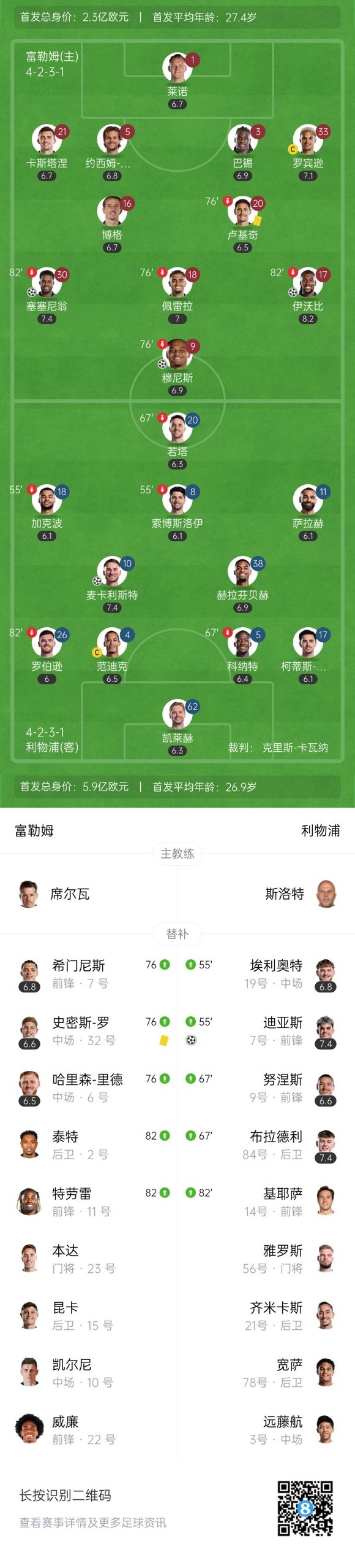 最终,富勒姆3-2利物浦。