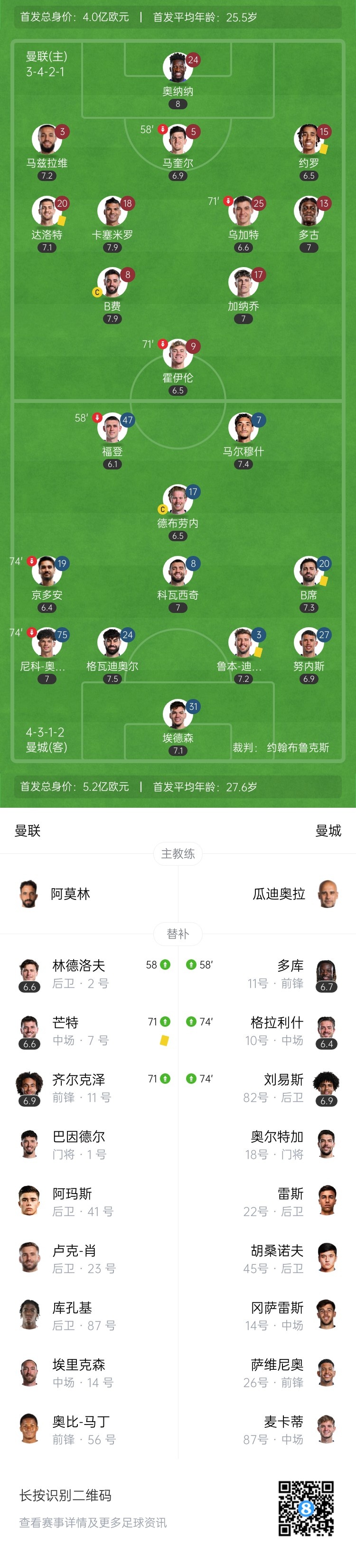 第77分钟,曼联反击,加纳乔分球,多古送出传中,禁区内齐尔克泽的射门被埃德森飞身扑出,随后芒特再补射被封堵。↓