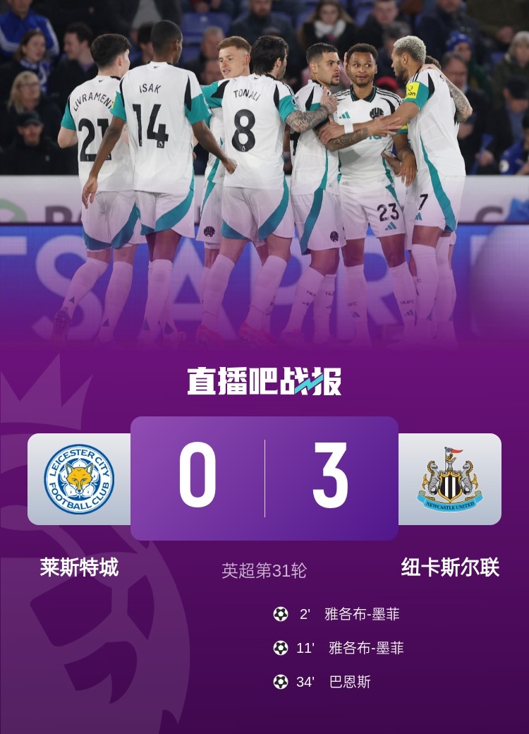4月8日讯 英超第31轮,纽卡3-0莱斯特城,纽卡取得联赛三连胜,莱斯特城遭遇联赛八连败。