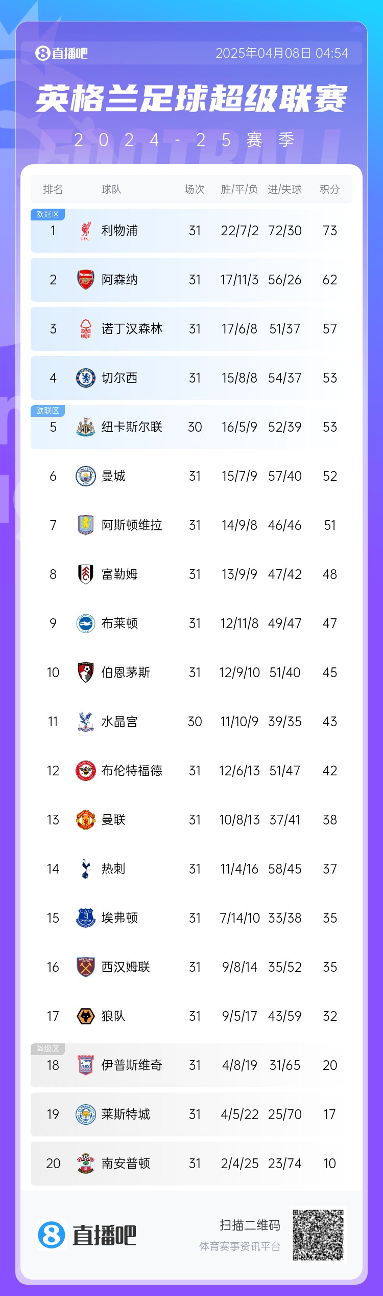 积分榜方面,纽卡少赛1场积分追平切尔西,暂居英超第5位;曼城多赛1场落后纽卡1分,位居英超第6位。