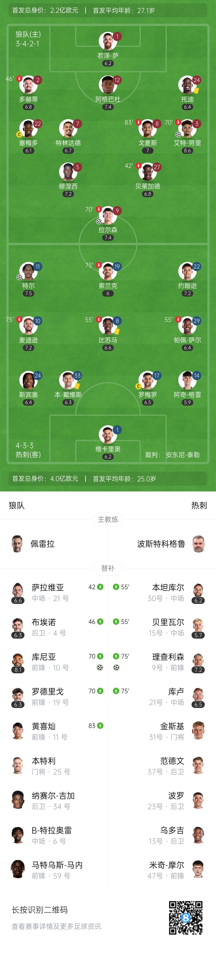 第85分钟,热刺角球机会,皮球开到禁区中央,罗梅罗高高跃起头球攻门!皮球被扑了一下后击中横梁,理查利森补射破门!热刺2-3狼队↓