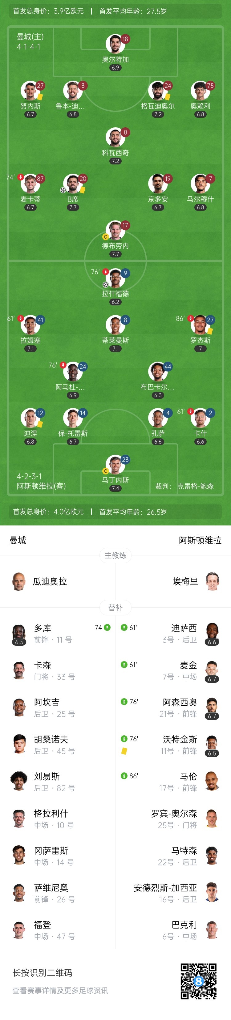 4月23日讯 北京时间3:00,英超第34轮曼城vs阿斯顿维拉,比赛在伊蒂哈德球场打响!上半场,拉什福德开场中柱,随后B席破门;迪亚斯送点,拉什福德点射扳平。下半场,马尔穆什破门但越位无效;多库94分钟助攻努内斯绝杀!最终,曼城2-1战胜维拉,终结维拉英超5连胜!排名暂升英超第3。