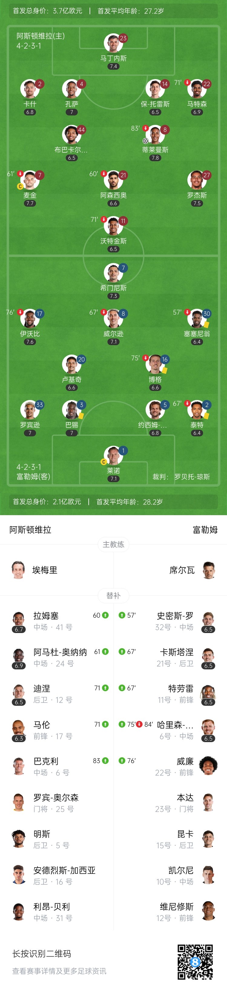 上半场伤停补时1分钟,半场结束,维拉暂1-0富勒姆。