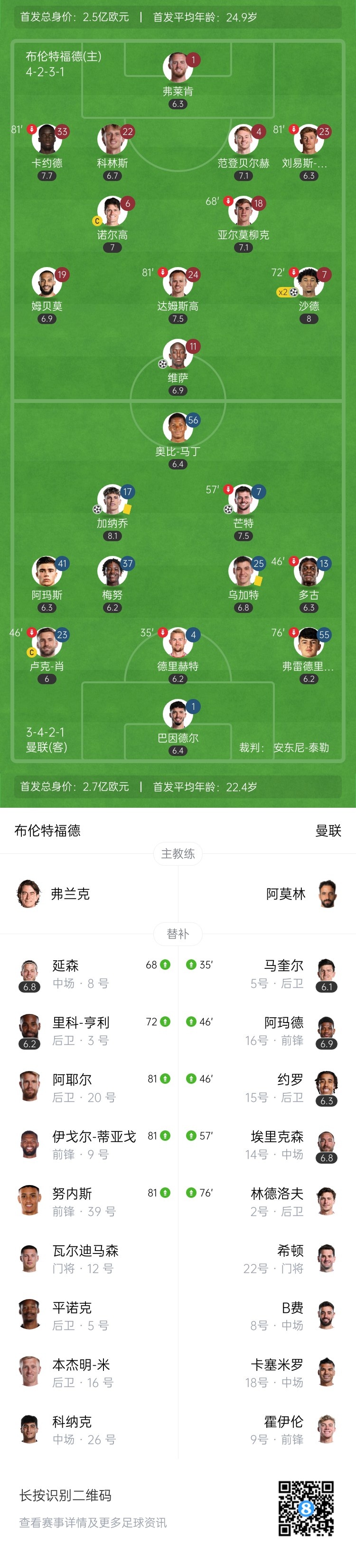 第74分钟,延森前场中路送出直塞,卡约德禁区内单刀球机会没有选择自己射门,而是送出横传,维萨将球扫近空门,VAR介入,确认进球没问题,布伦特福德4-1曼联。↓
