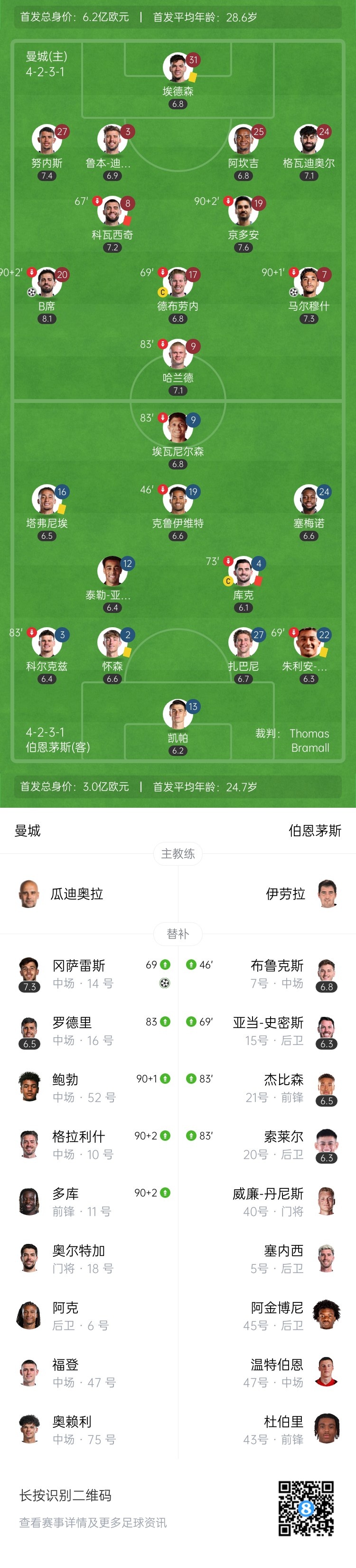 第83分钟,罗德里复出,换下哈兰德。↓