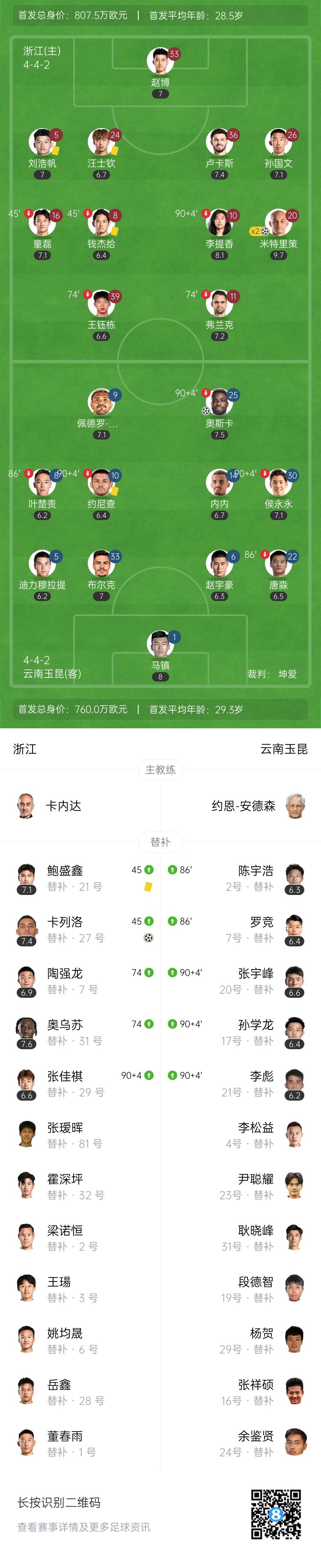 7月18日讯 中超第17轮,浙江主场迎战云南玉昆,比赛在杭州黄龙体育中心进行。上半场,侯永永助攻奥斯卡闪击破门,王钰栋失良机。易边再战,米特里策个人秀+任意球直接破门,浙江新援亚戈-卡列洛首秀替补建功。最终浙江队3-1云南玉昆。积分榜方面,浙江队23分暂升第七,玉昆22分第八。