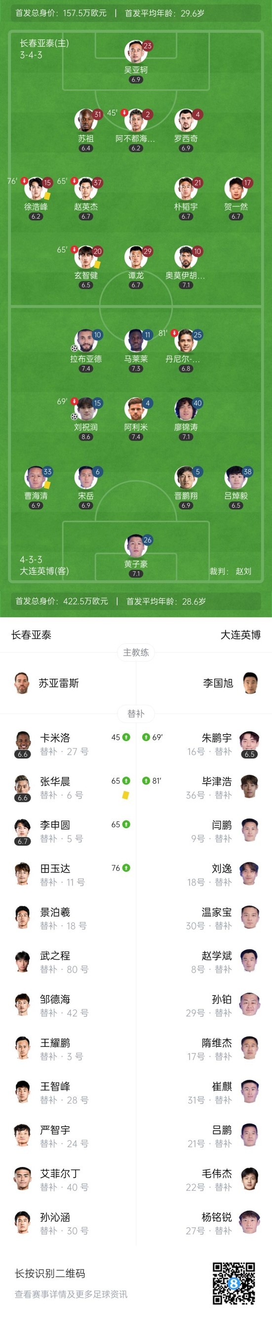 下半场补时7分钟,亚泰0-2大连英博。