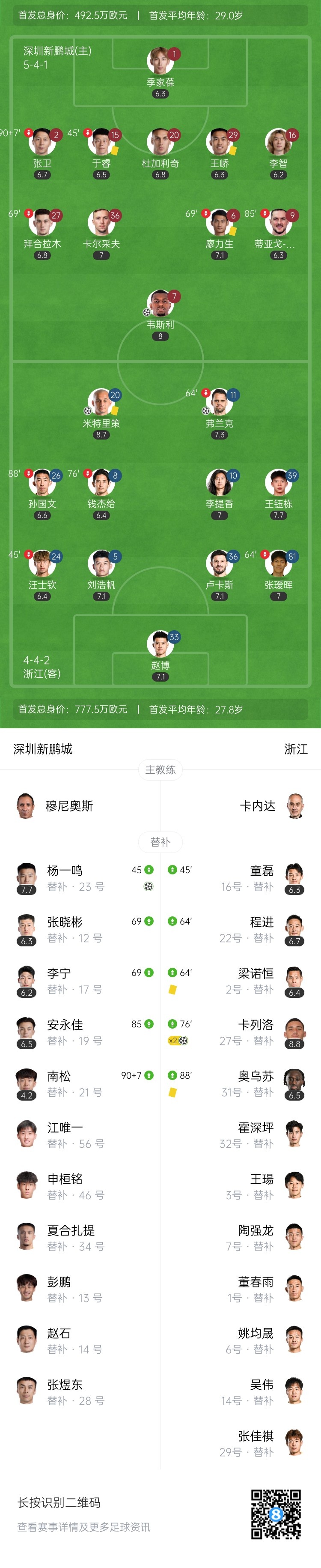 8月3日讯 中超第19轮,深圳新鹏城坐镇主场深圳市体育中心体育场迎战浙江队。上半场,韦斯利造险,米特里策精妙外脚背助攻弗兰克破门。易边再战,韦斯利连场建功,杨一鸣头槌破门反超,卡列洛远射中框后绝平+补时绝杀,韦斯利中框,米特里策读秒单刀锁定胜局。最终深圳2-4浙江。积分榜方面,浙江三连胜29分暂升第七,深圳17分第12。