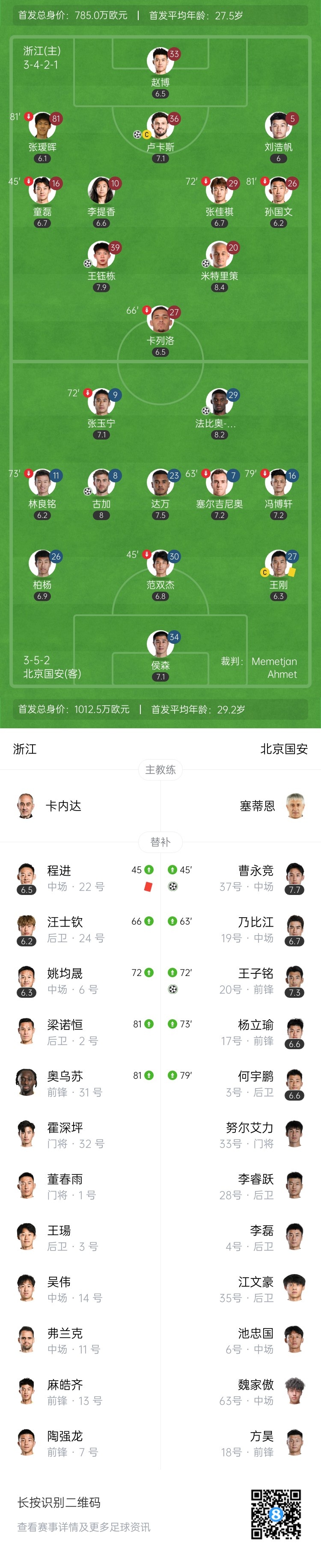 8月10日讯 北京时间8月10日19:35,中超联赛第20轮,浙江坐镇黄龙体育中心对阵北京国安。上半场米特里策助攻卢卡斯头球破门,古加远射扳平,随后米特里策一条龙破门,浙江暂2-1北京国安;下半场王钰栋再下一城,曹永竞为北京国安扳回一球,程进染红,王子铭进球为北京国安反超比分,最终浙江3-4被北京国安逆转,无缘四连胜,北京国安取近4轮首胜。