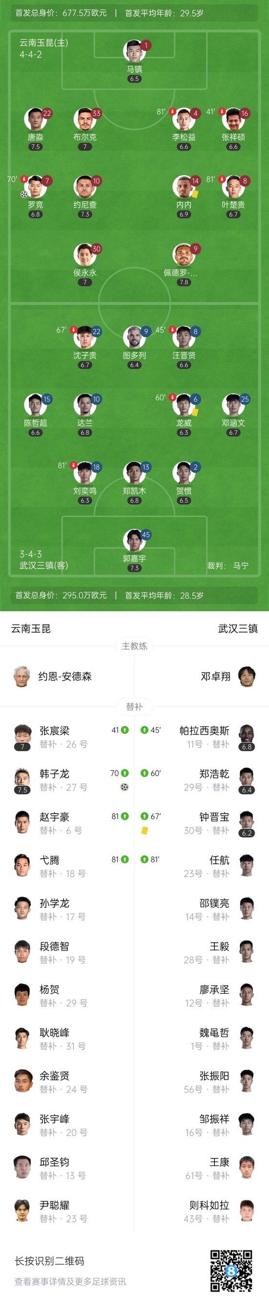 下半场补时8分钟,云南玉昆2-1武汉三镇。