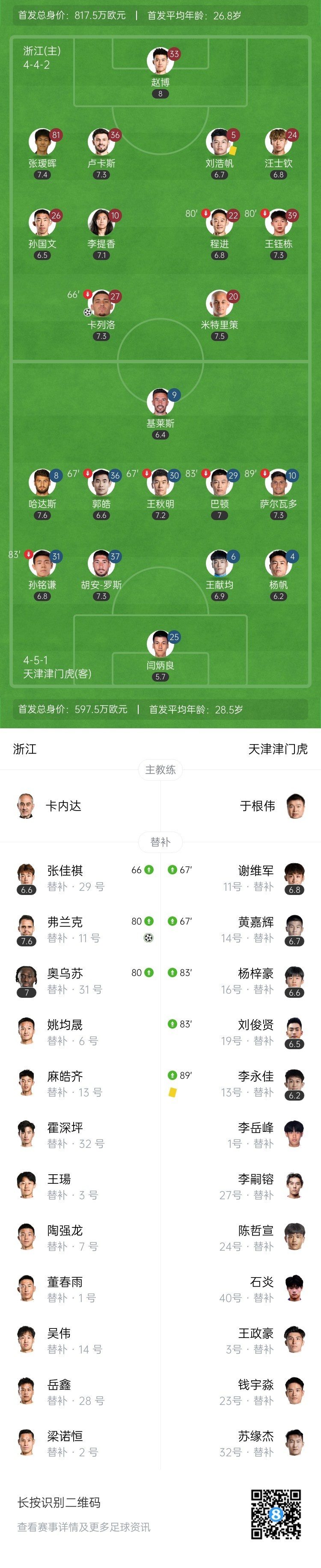 全场比赛结束,浙江主场2-0战胜天津津门虎。