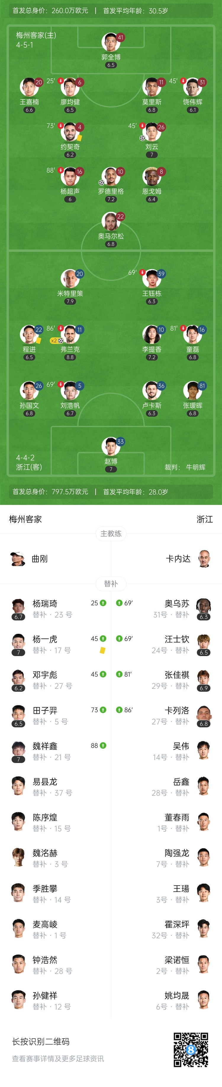 8月24日讯 北京时间19:00,中超第22轮梅州客家vs浙江队,比赛在梅州五华奥体中心打响!上半场,赵博脱手失误,奥马尔松失良机;廖均健24分钟伤退;米特里策前场断球后连过数人造点,随后被VAR改判任意球;王钰栋手球送点,刘云点射破门。半场补时阶段,王钰栋助攻将功补过,弗兰克包抄破门!3分钟后弗兰克再下一城完成双响!下半场,罗德里格扳平比分;王钰栋单刀中柱;罗德里格助攻恩戈姆破门,因手球被判无效!最终,浙江队2-2战平梅州客家。
