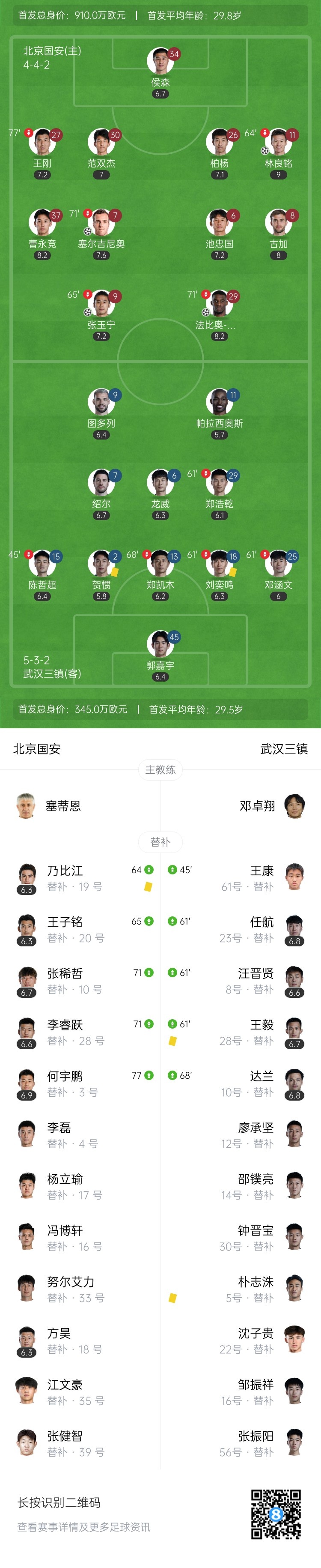 第53分钟,国安获得任意球,古加挑传禁区,林良铭抢在门将出击之前将球顶进球门!北京国安3-0领先武汉三镇↓