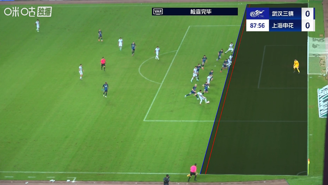 第71分钟,于汉超禁区内左侧倒地,主裁判听取VAR意见,没有判罚点球↓