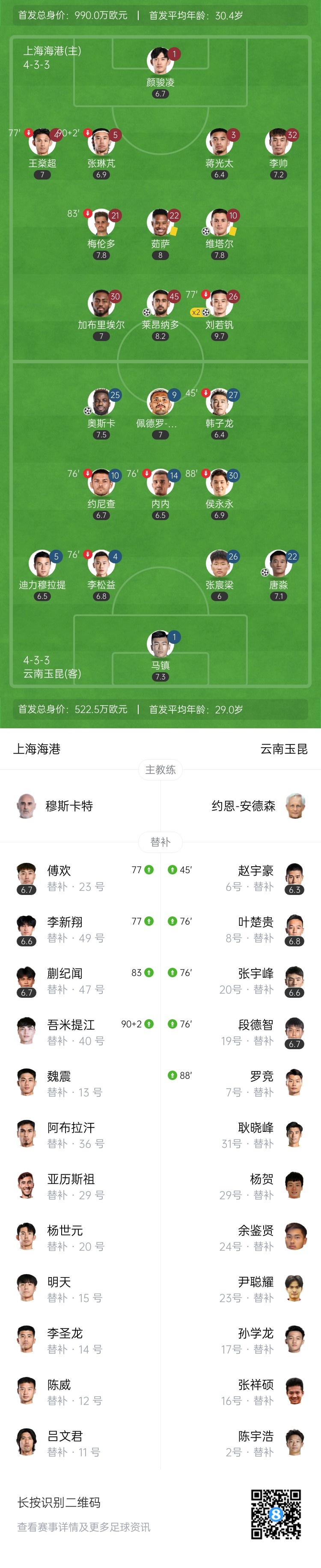第29分钟,刘若钒禁区前沿右侧送直塞,莱昂纳多插上禁区内右侧抽射破门,上海海港1-0领先云南玉昆↓