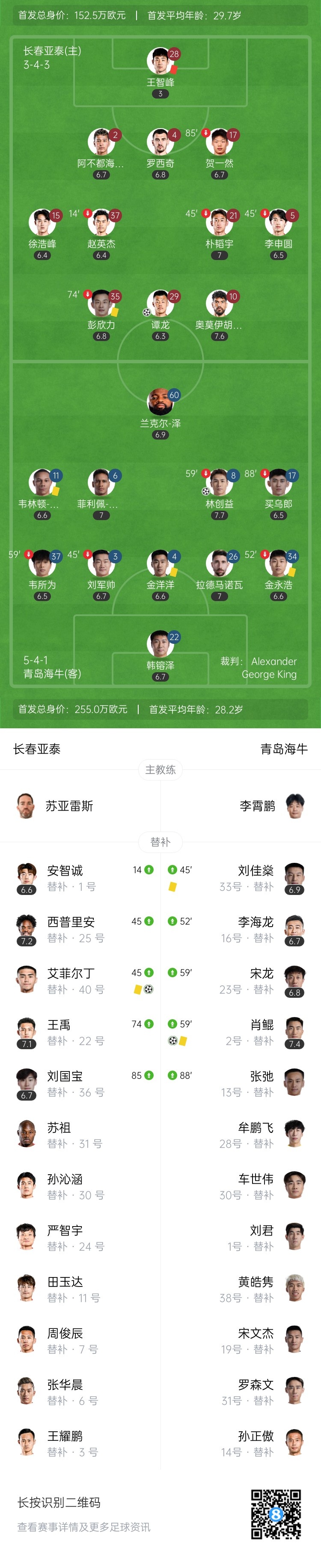 下半场补时7分钟。最终全场比赛结束,长春亚泰2-2青岛海牛。
