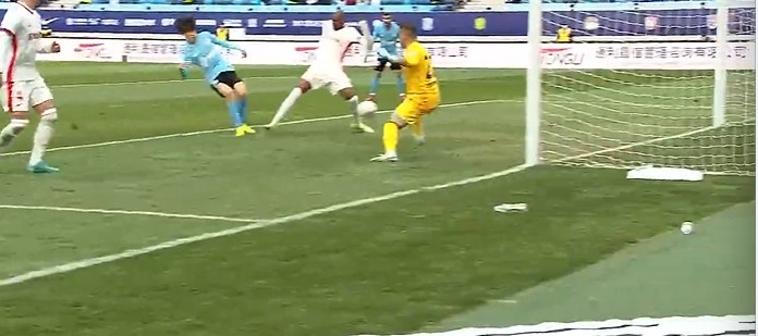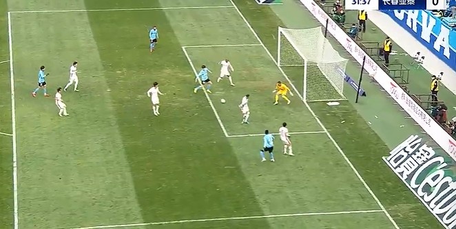 第14分钟,亚泰左路玄智健下底传到禁区徐越门前头球顶偏了。↓