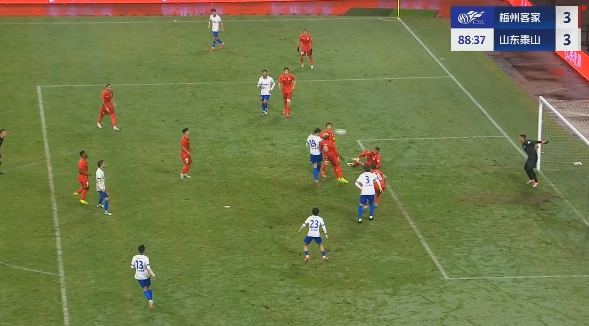 第88分钟,泰山队扳平比分,刘洋左路精准传中,泽卡高高跃起头球破门梅开二度,山东泰山3-3梅州客家。↓